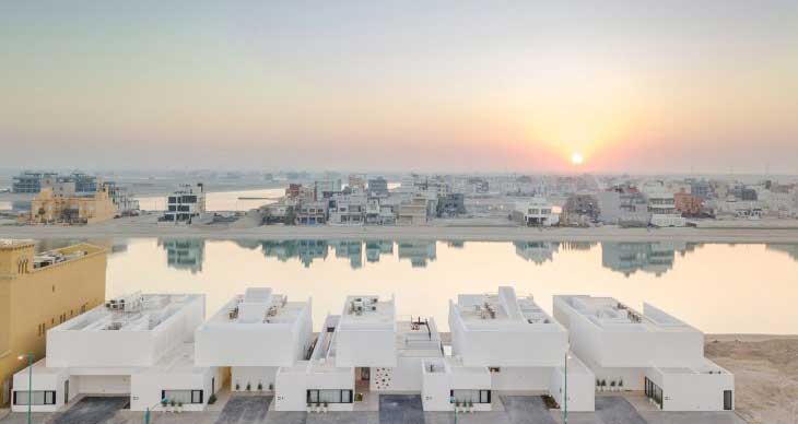Associated Architects Partnership公司设计了南科威特Khiran度假村项目的住宅建筑。这是一组排屋,分别是五座线条简洁的白色房子,俯瞰运河。Areia住宅的几座建筑中,根据泳池和露台设置而各有不同,比邻200公里运河,该运河是为了营造度假设施而专门开挖的。