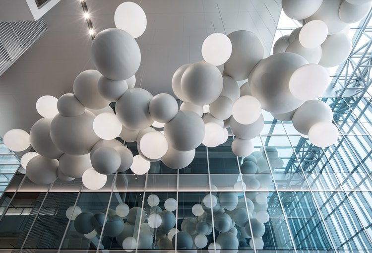 建筑北侧高18米的入口中庭,被称为“创意客厅”,它通过玻璃幕墙向城市开放。幕墙内,悬挂着法国著名艺术家 / 摄影师Charles Petillon创作的巨型装置“心跳”。Charles Petillon以其大型气球装置而闻名,此次的作品在赋予空间戏剧感的同时,也让中庭的巨大尺度更为人性化。在创意客厅里的悬浮会议室中,员工们可以一边从“云端”俯瞰人来人往,一边进行头脑风暴。艺术渗透万科时代中心,在建筑中的其他公共区域内散落布置了8件现代艺术作品。
