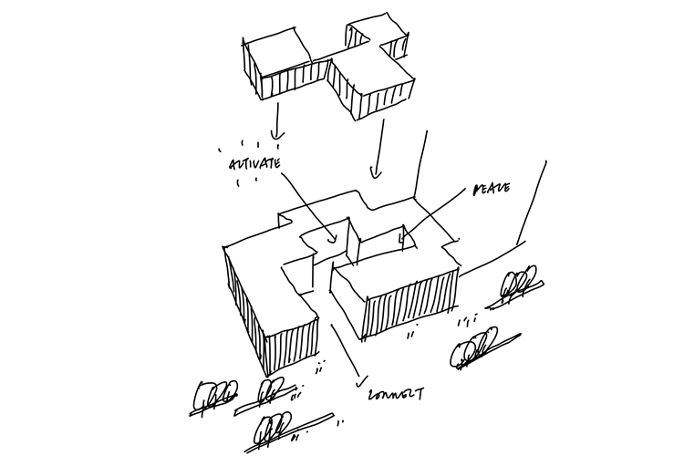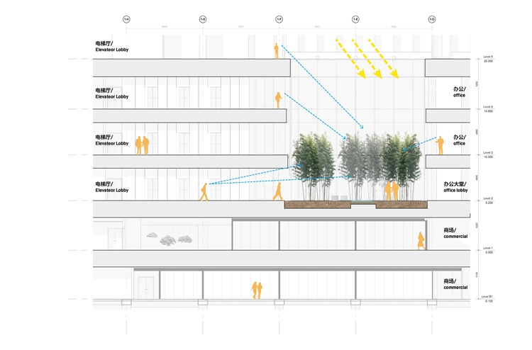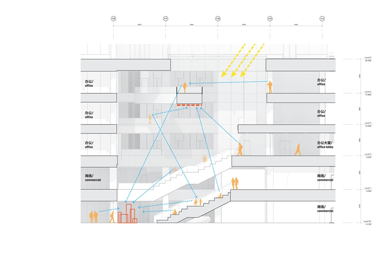 原建筑主体由四层规整的矩形平面构成,中间有一个服务于空间流线的小型采光中庭——这是典型的20世纪90年代大型购物商场的布局。为了将更多的自然光线引入建筑空间,SHL在建筑中打造了三个共享中庭——其中两个意在增强空间的流通性,也旨在将充足的日光更好地引入楼层内部。另一个中庭则位于沿街面,从而形成了一个高挑明亮的主入口。作为连接城市生活、激活室内空间的载体,三个中庭的空间均按“室外化”理念进行设计,室外铺地、玻璃幕墙等从室外延伸到室内,在中庭中就如同漫步在室外。办公空间围绕中庭形成了三个不同的组团,平面布局经济高效,均能享受到来自不同方向的自然采光,并拥有独享屋顶花园的中小型办公阁楼。