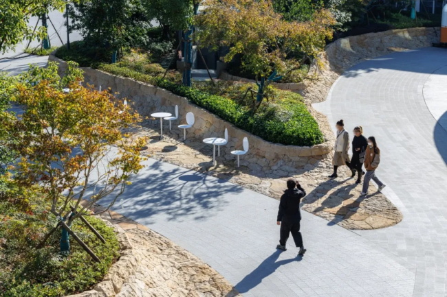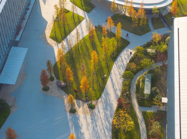 项目总占地22.8公顷,景观面积15.7公顷,树叶形状的空间结构形成建筑和景观互为图底的拓扑关系,为建筑创造最优的景观视线联系,也为内外景观的渗透带来先天优势。景观设计从景观视线通廊控制、栖息地营造、慢行系统连接等多个设计策略将园区内部的景观和外部的生态廊道联系起来,使场地同山水空间有机的生长在一起。