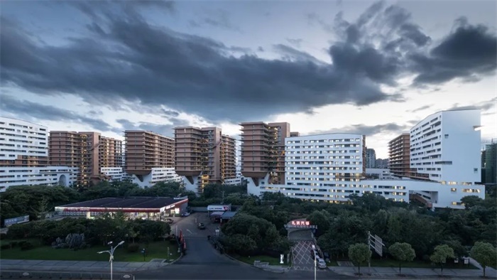 为了让空间尺度更亲切、舒适,我们用白色与木纹涂料分界7层空间上下;东西向立面采用预制镂空砖,用低成本的物理节能方法实现遮阳隔热。衢州古城门和传统民居给予我们形式灵感:大尺度的古城拱形门洞增强了居民回家的仪式感,高层立面的水平挑檐唤起“老宅披檐”的衢州记忆,兼有防水、防雨等现实功能……