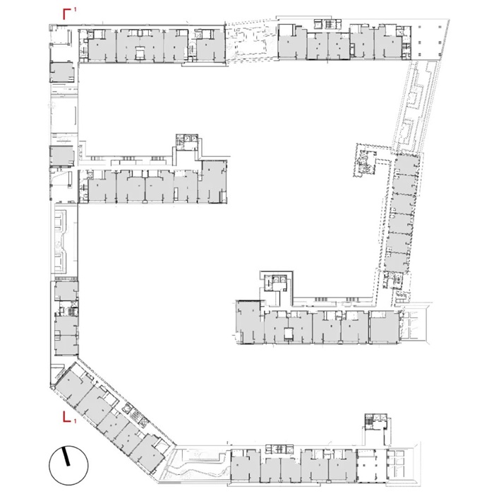 熟人基础让我们可以采用外廊式住宅布局,每层以 4-6 户为单元,在满足高容积率指标、不同户型灵活组合的需求下,实现了更多的交往与活动空间。而部分核心筒外置,不仅能为户型争取到更好的通风条件,其与外廊相连形成的更大平台空间,也为居民归家、停留和偶遇的发生,提供了更多的可能性。