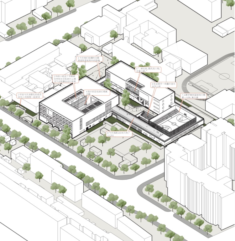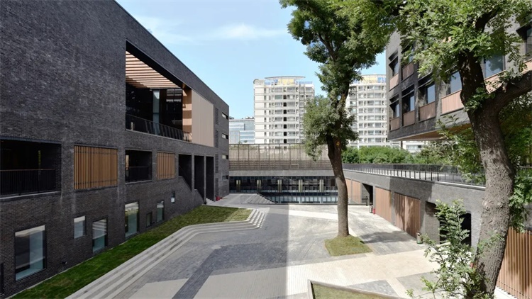 本项目为北师大附中西校区的改扩建,基地位于北京市中心区,毗邻南新华街,与学校本部隔街相映。东侧为低层住宅,南侧为北京第一实验小学,西北侧为规划四合院。规划总建设用地12,274.12㎡,用地形态不规整,现有绿化率仅为8.03%。项目规划总建筑面积26,088.66 ㎡(其中地上建筑面积12,210.24㎡,地下建筑面积13,878.42㎡),在容积率1.0及建筑高度18m限高的规划条件下,充分利用地下空间,采用多级院落空间布局,扩大中心院落空间,提高绿地率至21.7%。为良好地延续场地记忆,增强师生对西校区时空的认同感,设计中保留了场地内国槐、银杏等10棵大型乔木,并根据抗震加固鉴定报告,保留了原教学楼主体部分并改扩建为学生宿舍。