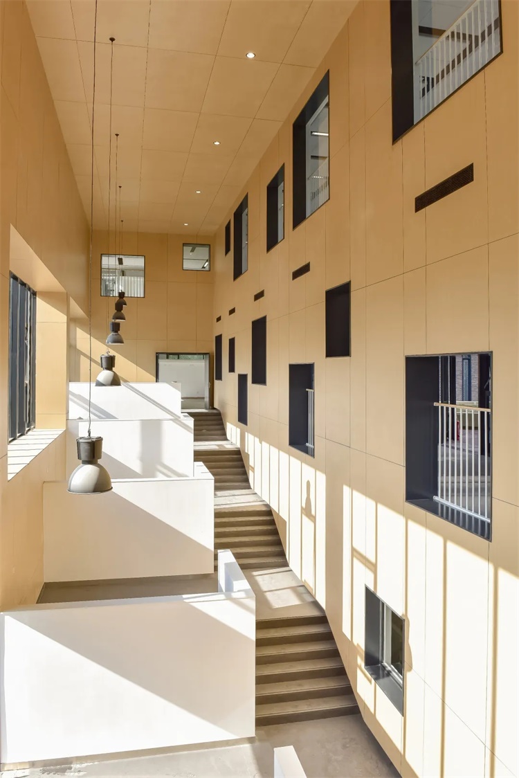 设计中将教学楼、体育馆、宿舍三者通过二层平台和首层风雨廊紧密地联系在一起,并将开放式学习交流空间——交流讨论区、开放式答疑区、思维广场、思维匣子融入教学楼、宿舍内部,在形成多层次“院”——中心庭院、下沉庭院、屋顶庭院的同时,使生活和学习空间复合式地融通在一起。通过这种方式唤醒校园与历史古都、传统文化之间的联系。在建筑外部,“院”成为学生重要的课外活动场所,也是他们“相互授业”交流的场所。在建筑内部,开放式学习交流空间使学生的生活与学习空间进一步融通,设计上设置了各式各样的开放式书架,使“书”随处可见,学生可以随时随地的与“书”对话。现代书院不仅是学生生活和学习的空间,更是他们自由交流、快乐成长的场所。