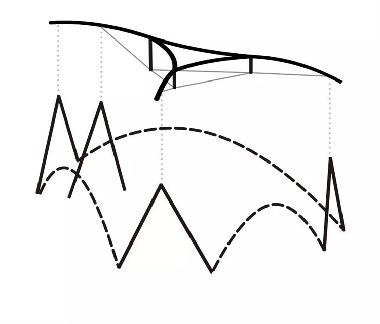 设计的初始概念是“嵌入场地的帐篷”:以人字形的帐篷为原型,提供在自然中庇护的感受;通过分叉,吸纳来自园区、遗址、田野三个方向的动线,使人们可以在此穿行、停歇。在后续的推进中,我们结合外部和内部的空间需求对“帐篷”进行了异化,通过边拱向三个不同方向的景色打开。最终的形态好像风拂过,帘子鼓胀起来。这也是“风之亭”名字的由来。