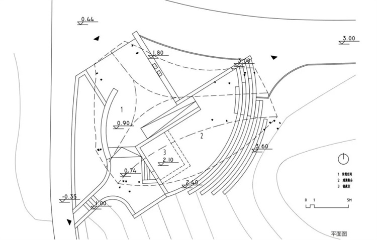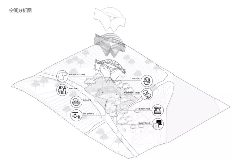 场地西低东高,坡度接近13%,高差约3米。我们将两个主要平台的标高差定为1.2米,用坡道连接,意图是希望人们可以高高低低地自由穿梭,混合使用。高平台作为小剧场,可以容纳近百人席地而坐。后部环形座位嵌入山体。人们可以轻易地走上山坡,远眺田野。低一些的平台是品茶休憩的场所。挡土墙结合水池设计,可以满足清洗加工的需求。到了采摘季,可以和西边的烧烤台地联动使用。