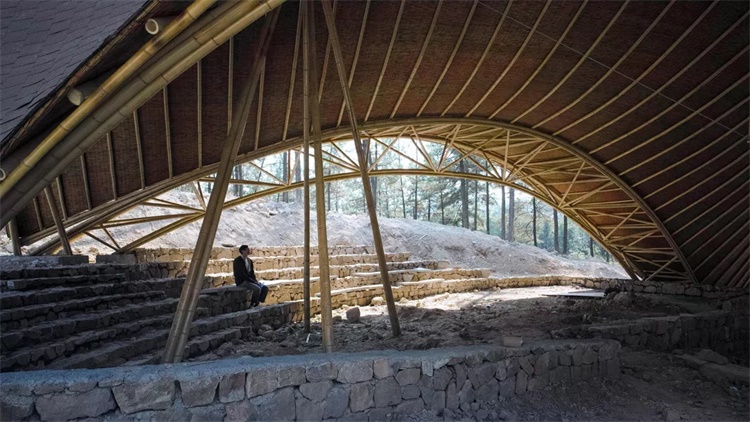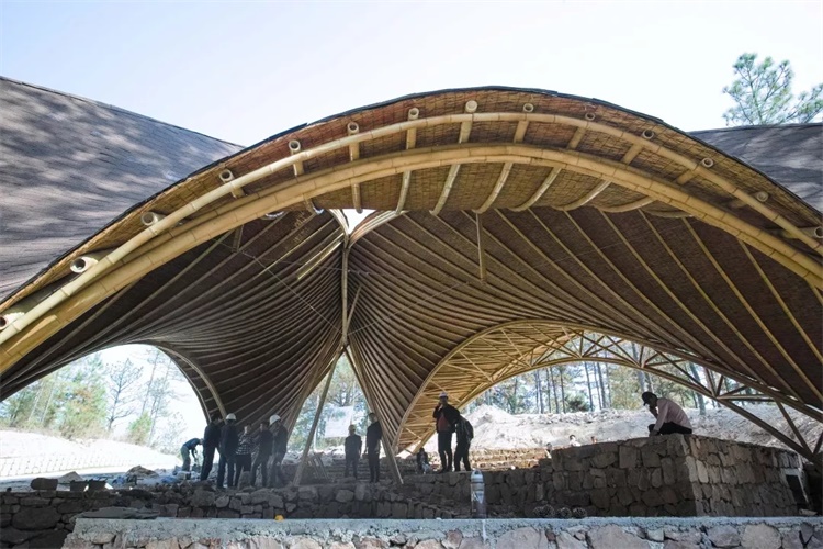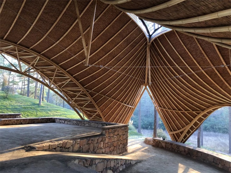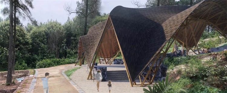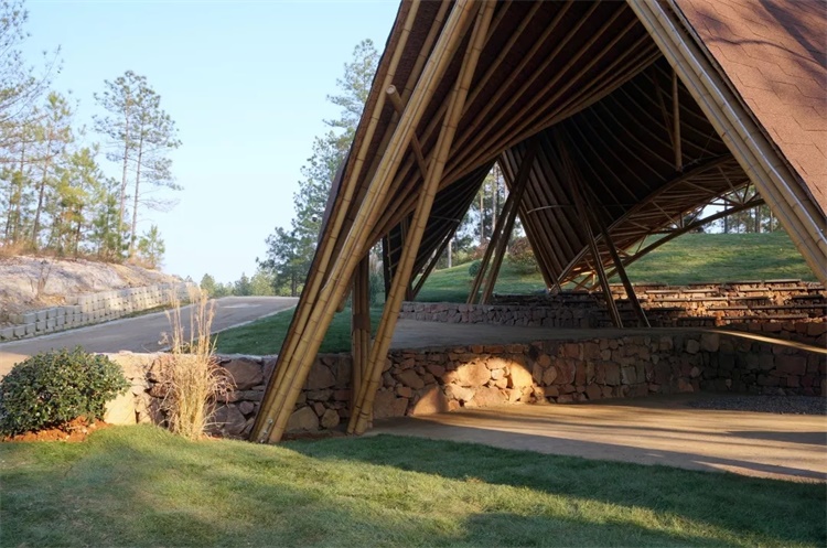 常用的排架方式会增加落柱,对空间产生较大的束缚感,结构对此进行了改良,选用自平衡的弦支竹梁进行空间的跨越,成组 的人字柱获得体系的竖向承重及水平抗侧能力,大大地减少了结构杆件的数量,实现轻盈通透空间感受的同时,也获得了较好的经济性。