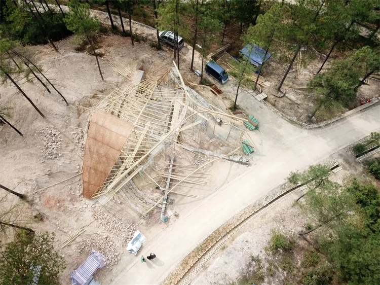 “风之亭”的场地位于安吉龙山源。这里处在天目山的余脉,拥有山丘、田野、水塘、茶园等多重景色。这里也是越国贵族墓群的所在地。近些年这里被保护性地开发,形成了一片结合自然与人文游赏的公园。业主希望以竹为结构,在这里建造一座可供人休息、并容纳小型演出和团建活动的构筑物。