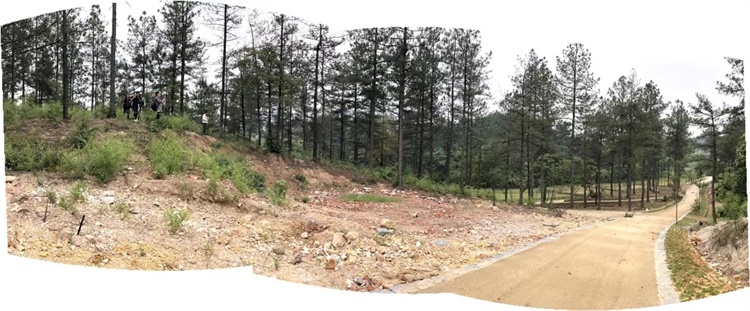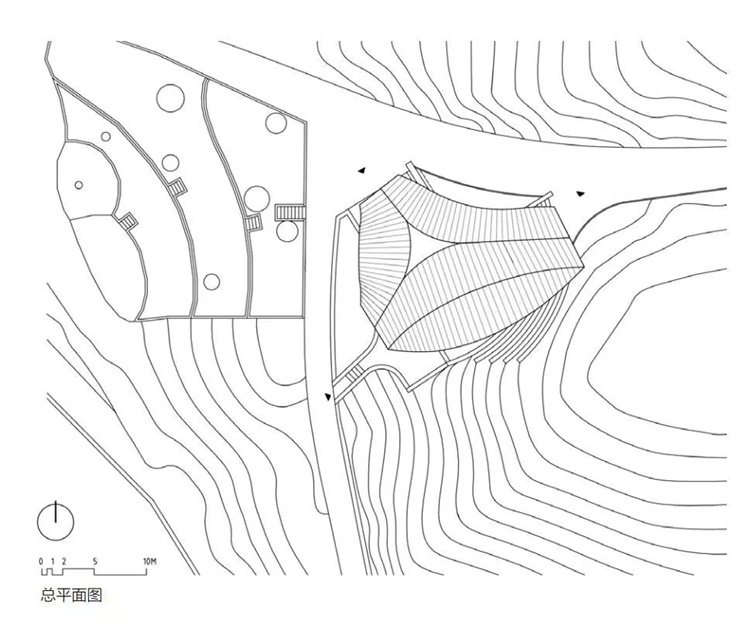 基地选址在一个三岔路口旁的坡地上。主路连接园区和遗址,岔路连接着更低处的田野。这里曾经有一处砖房,如果可以利用这块空地,则可以尽可能少地破坏场地周边茂密的松林。场地曾被被简易地平整过,因此在东部有明显陡坡。