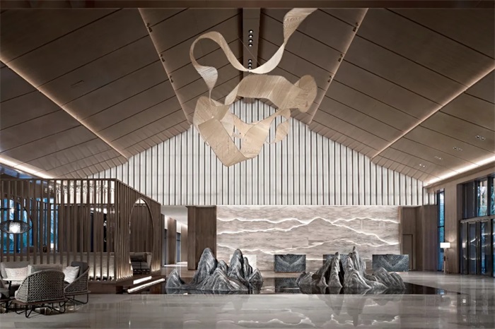酒店建筑在文化符号上注重对传统建筑文化和园艺风情的表达,让体验者立体地感知中国传统文化的传承和自然园林的趣味。在空间规划设计中,建筑群体呈围合院落式轴线对称布局,中央围合园林庭院,配以中式景观亭台楼榭,汲取了中国传统建筑空间的精髓。在外观设计中,将传统建筑语言加以抽象和演化——依据传统建筑比例打造三段式石材墙身、典雅大气的传统缓坡大屋顶、疏密变化且光影斑驳的仿木格栅、富有韵律排列的檩椽造型、镂空雕花且低调奢华的宫灯造型等,其灵感均来源于中国传统建筑的“礼乐”思想,古为今用,传承延续,同时也成为酒店本身的价值所在。