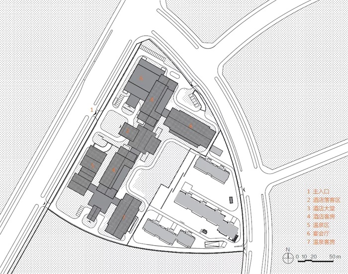 规划布局精心而严谨。由于西侧世园会园区是该项目的视觉焦点,整体布局采用大“U”字形布局,开口朝向西侧世园会,沿地块西侧布置主要的酒店客房,东侧设置世园公寓,地块中央则围合出具有中国古典韵味的中央庭院,使整个规划形态呈现东高西低的形态,在使酒店客房拥有良好的景观的同时,减少了对西侧道路的压迫感,形成空间的自然过渡。