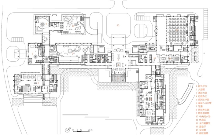 作为世园会专属配套接待设施,世园凯悦酒店以其完备、高端的各项功能为客人提供独特的入住体验。酒店主入口垂直开向西侧延康路,形成比较大的礼仪广场,并沿轴线连接大堂,空间延续至中央庭院,突出了酒店地位。多功能宴会厅置于北端,设有宴会厅独立入口,便于会时及会后的多功能使用。客房楼沿延康路、阜康路依次展开,保证50%以上客房拥有世园会景区景观,其余客房均拥有院落园林景观。餐厅、温泉配套、泳池等配套设施围绕庭院错落设置。