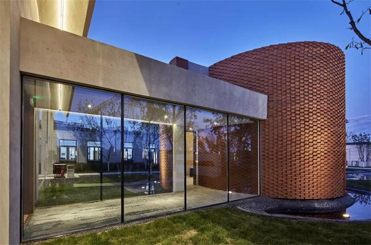 内院与主体建筑通过通透落地的玻璃廊道进行连接,与VIP接待室本身的砖砌外立面形成质感上的对比,这种对比暗示着客人从一个共享、开放的空间逐步进入相对私密、内向的空间,从而获得一种精神上的收敛。
