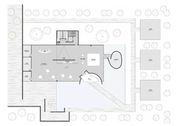 原本在概念方案中位于东侧的VIP接待室在实施中被移至北侧,形成了一个富有浪漫气息的内院。
