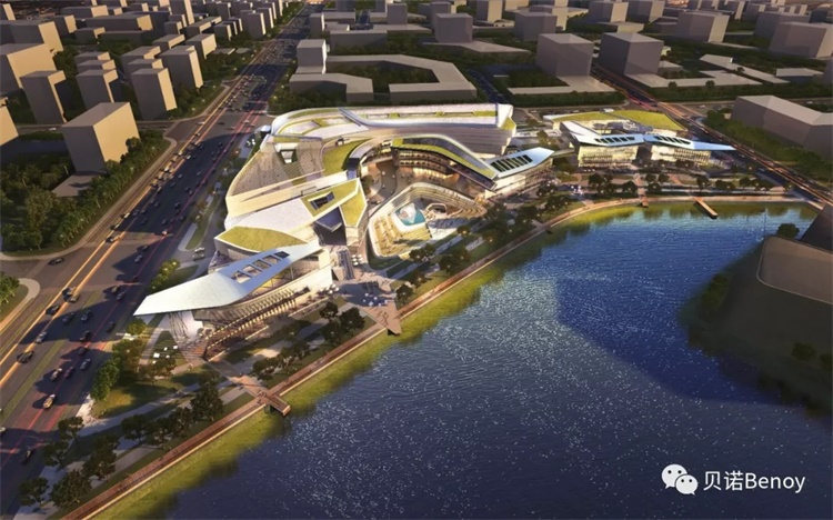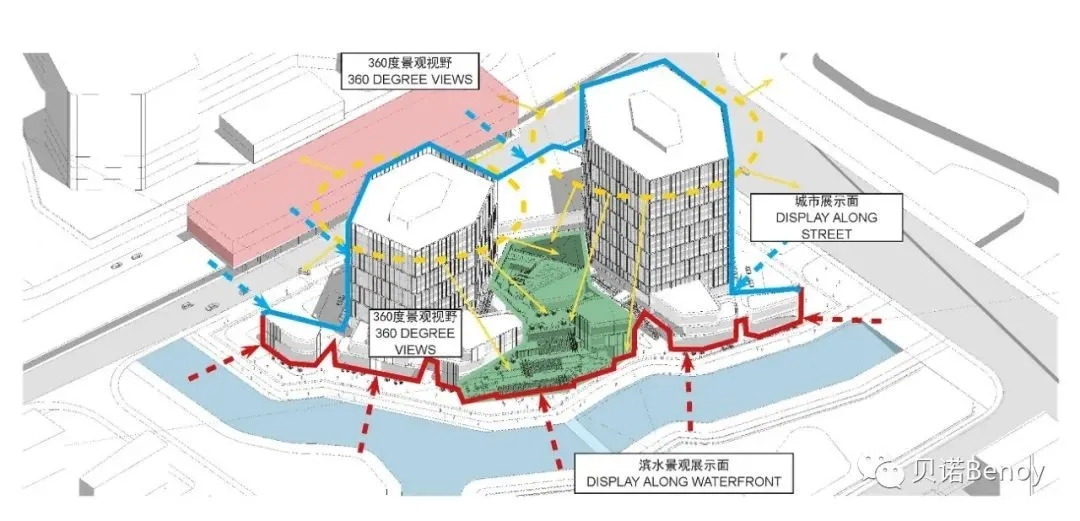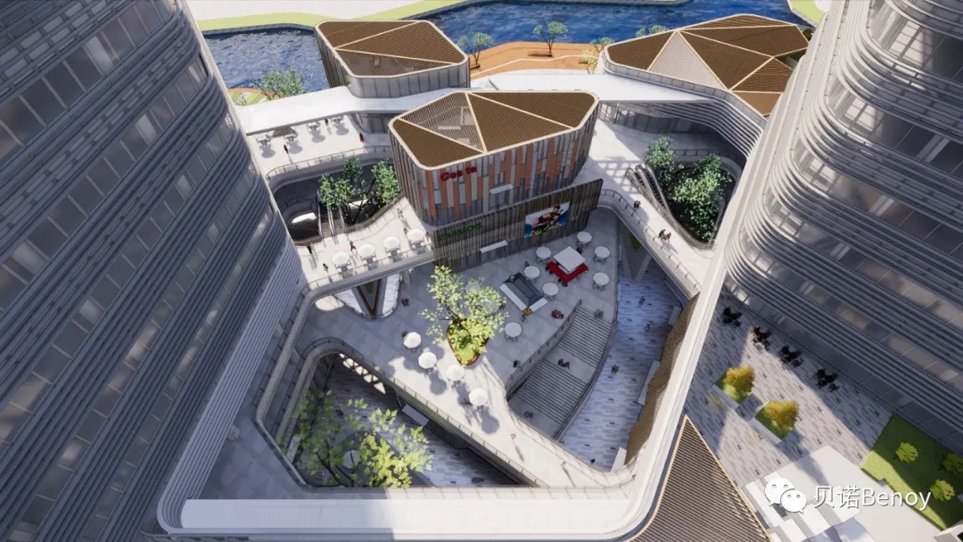 通过设置架空的人行系统强化地块重点区域和可持续高效交通系统之间的相互联系,由此将地块内的机动车交通量降至最低。基地南面临水。通过沿南面水面,商业裙房处理成层层跌落的退台空间,结合滨水大平台和中央庭院。最大化地延长了滨水的景观面以及活动场地。滨水部分处理为小尺度相连的折线,以打造宜人尺度的滨水休闲空间。Benoy同时对街区和建筑单体进行了精心设计,将其打造为多用途混合的综合体以创造不同的特殊体验,并赋予项目个性和提升附加值。