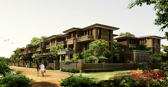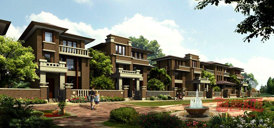 本项目分为高层住宅组团和低层住宅组团,分别位于小区北侧及南侧。道路系统为完全的人车分流,地面布置人行道系统,地下结合地下车库布置车行道系统。北侧高层住宅组团利用前后两排楼之间空地形成两个集中的块状绿地,布置大尺度的园林景观;在南侧低层住宅组团则由每户住宅的南北小院构成分散的点状绿地,各排之间空地形成带状绿地。建筑立面风格为草原式风格,特别注意同周围自然环境的配合,形成了一种具有浪漫主义闲情逸致及田园诗意般的典雅风格,建筑主体深红色面砖与顶部白色粉墙形成强烈对比,底部配浅色石材更显品质感,整个建筑材质更有利于建筑外立面效果的耐久性。