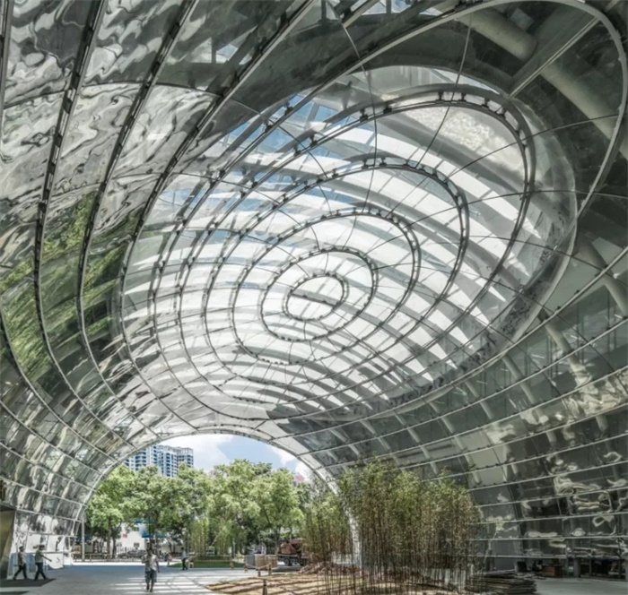 穹顶顶部设有天窗,当阳光射入的时候,经由玻璃的反射和折射产生普通直面玻璃建筑所不具备的水晶般的光影效果,营造出一种前所未有的入口前厅的体验。这个入口前厅由于完全开放,又具有很强的城市属性,为往返附近物业及公共交通站点的人提供了一个有趣的,能遮阳避雨的捷径通道。它从预设中私有的「共享大厅」转变成了真正「与城市共享的大厅」。而两家银行也回避了他们担忧的物业权属不清会造成的管理问题。