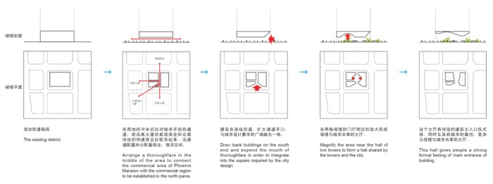 我们选择了以退为进的策略来破解项目中的矛盾。一方面,我们决定不去讨论到底设计出怎样标新立异的塔楼能在周围楼宇的夹缝中与他们争奇斗艳,而是设计两座方整简约的塔楼,以理性谦逊的姿态融入到整个中心区的城市肌理中,这实际上也符合银行建筑庄重低调的气质。