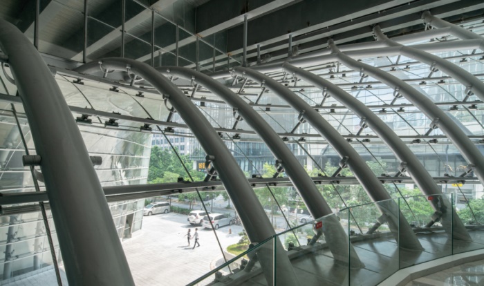 另外,尽管裙楼有大量的曲面,几乎找不出几块相同的玻璃,我们仍设计了一个标准的节点系统来适应任何形状及任意角度的玻璃安装。通过尽可能平面化的主次龙骨结构体系,和吸纳了「单元式幕墙」构造特点的,类似「齿轮」机制的抓节点设计,大大提高了建造效率。