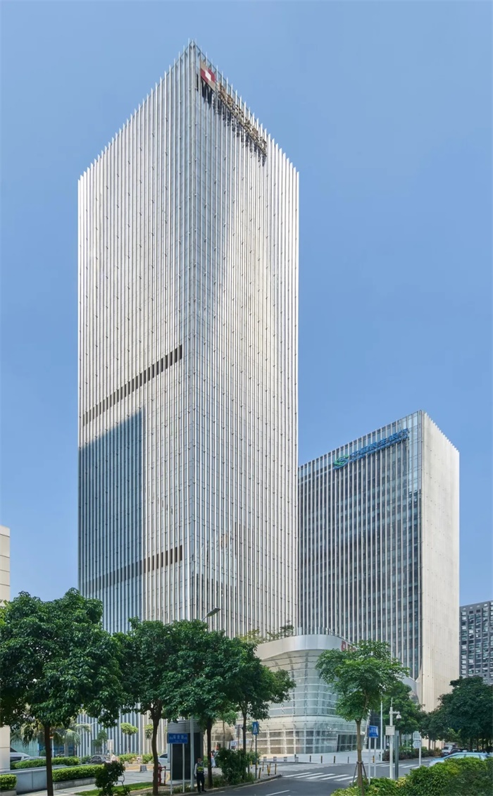 尽管塔楼形体方整简单,我们还是对立面植入了细微的处理。我们以竖向遮阳百叶为主元素,但百叶在塔楼顶部以及受太阳辐射最多的角部扭转为45度,长度比垂直的部分更长,遮阳效果也更佳。一眼看过去,这个塔楼并不出众;但由于这个扭转的存在,在某些光线角度看似乎又蕴含着戏剧化的、耐人寻味的效果,试图探索一种「和而不同」的美学。
