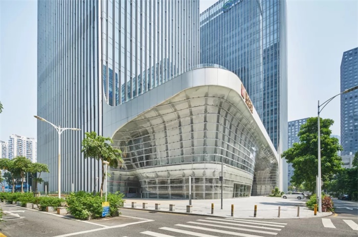裙楼的流线造型从「共享大厅」延伸到西南和东北两个角落,布置公共性更强的银行营业厅、配套商业等公共功能,进一步激活空间的公共性;而西北、东南角则让塔楼直接落地。「软」的裙楼公共界面和「硬」的塔楼形象面碰撞融合,让整个建筑更加生动。
