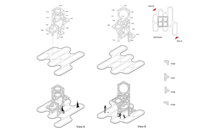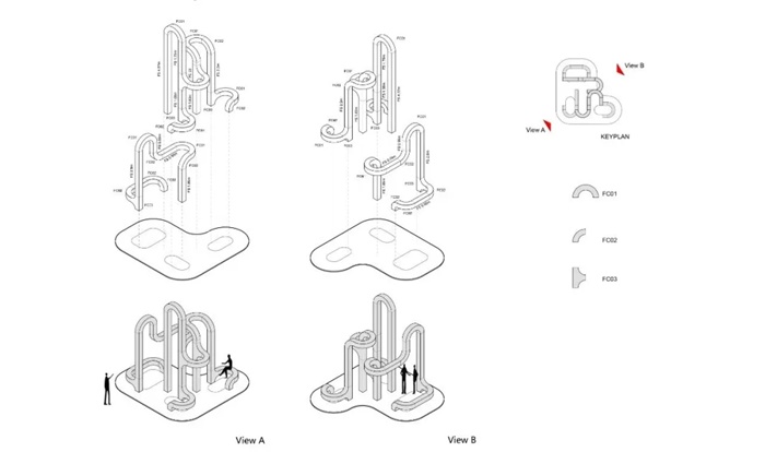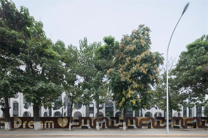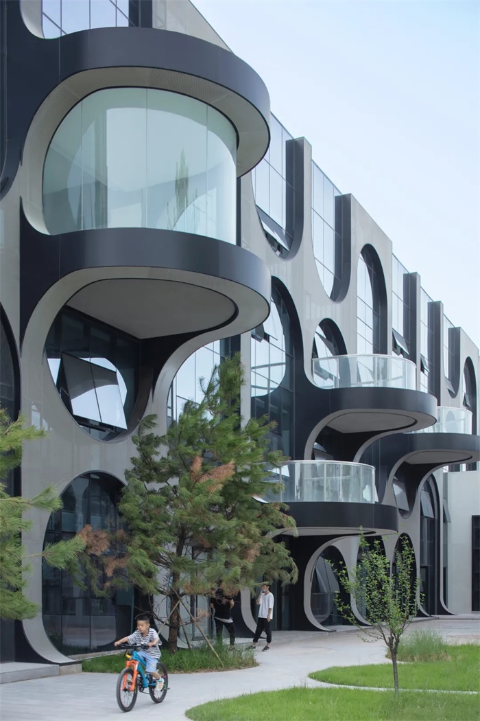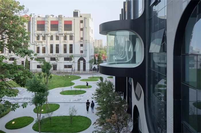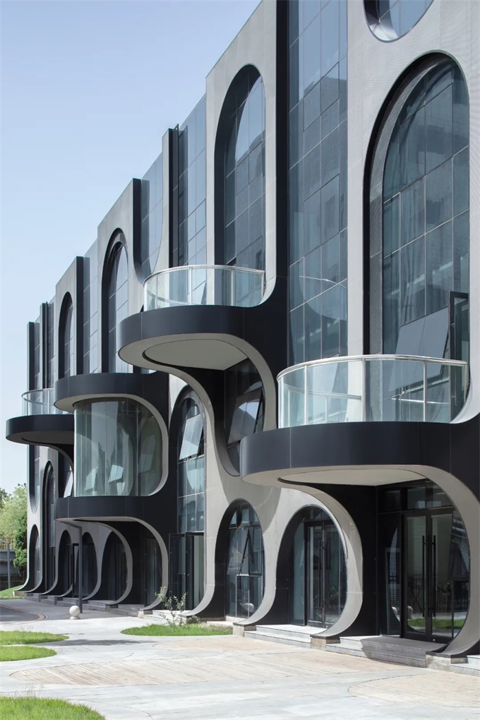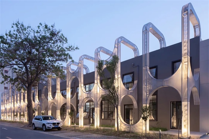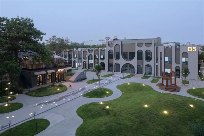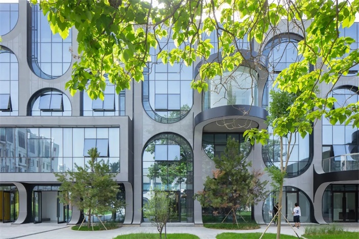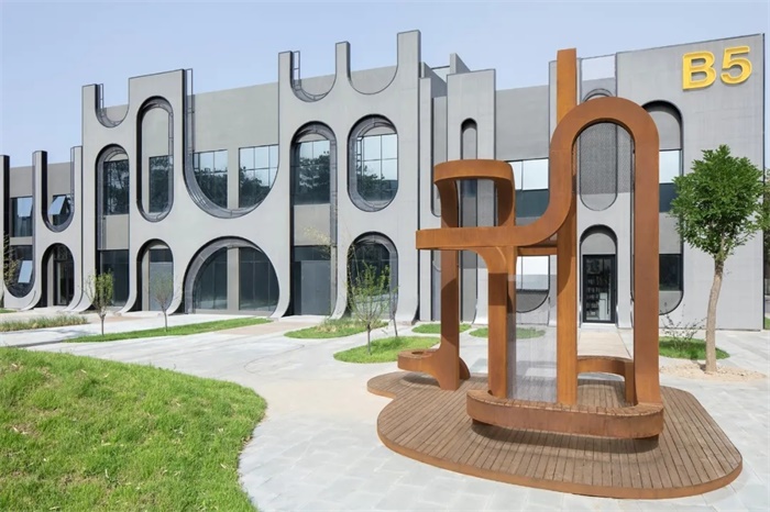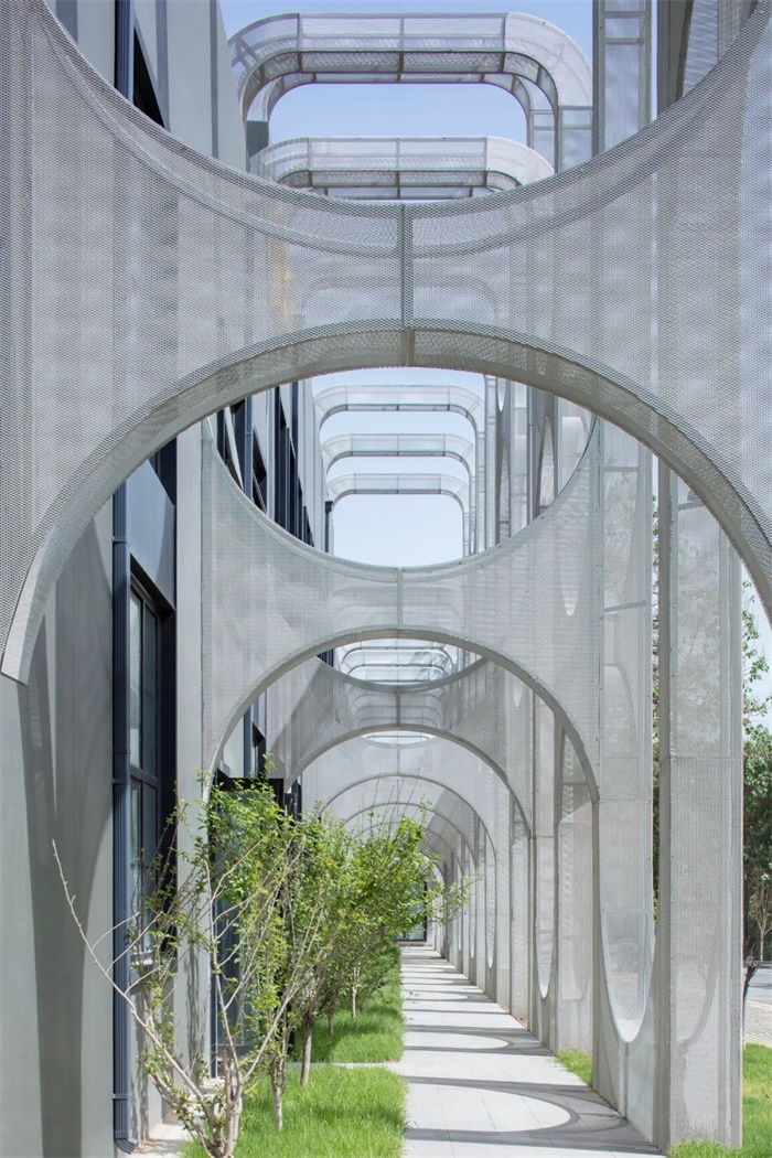 北京Fashion Factory的B庭院是整个园区的最“时尚实验性“的设计。整个庭院的建筑立面与景观造型一体是一个独特环境与语言,通过针脚编织的概念,三面围合的建筑外墙的线条与拱门的运用创造了空间的连续线性, 将一座建筑的立面造型轮廓与景观的曲线轮廓缝合在一起。这些简单和重复的造型可以引发强烈的节奏感, 使眼睛能够从景观到立面和背面进行追踪,同时还利用了一套简单的零件套件,以便于制造和施工。
