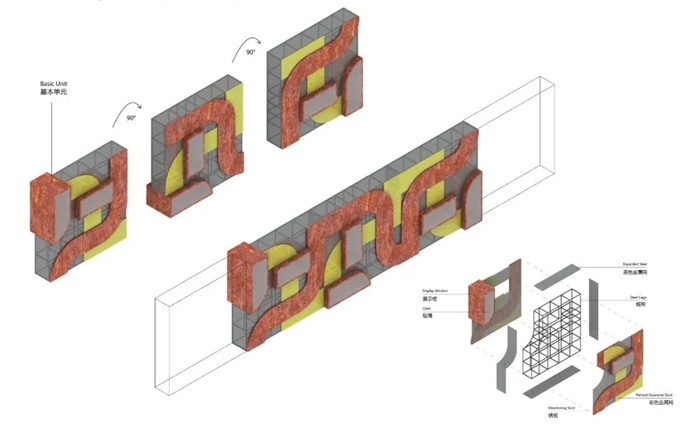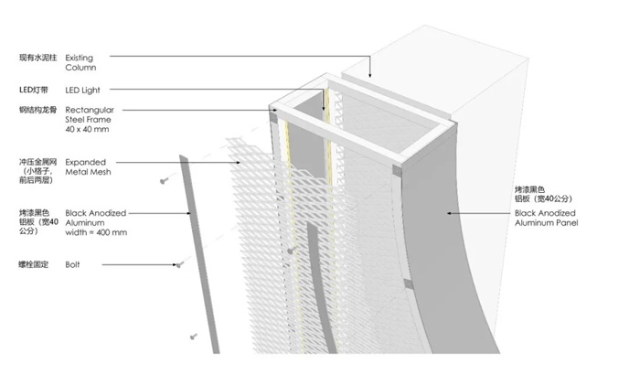 从景观到建筑表皮,工业钢网的使用赋予了建筑造型的硬与软的两种特质。凸出的半弧形阳台与展示橱窗增加了建筑表面的立体性与韵律。幕降临时,金属钢网做为建筑外表皮富有节奏的外衣被隐隐点亮,金属网会在庭院中作为一个连续缝合的曲线发光。在两座建筑对视的景观庭院的中央是线性的T台时尚秀场,建筑表皮的拱形曲线及韵律转折的造型成为了表演的背景,几何的拱形和转弯进一步参照了时装模特在T台末端的转弯,使充满韵律的流线在建筑的立面及景观中浮动。像山谷般的绿洲给庭院的景观增加了立体性及体验性,使整个庭院及建筑立面成为一个有机的整体。