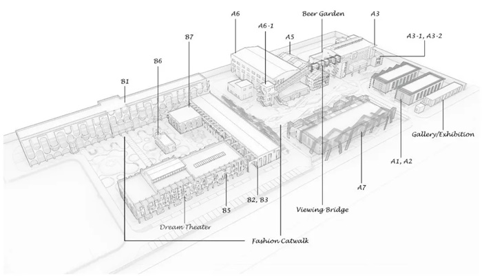 整个园区在不同的庭院为企业提供了一系列的便利设施。这里设有实验剧场和放映空间、挑高礼堂、时尚跑道/T台秀场、美术馆和休闲音乐吧、布鲁克林风格地下展厅等,可适应大中小企业活动。这些功能通过场地的改造与重新挖掘提供了不同尺度的共享空间; Beijing Fashion-Factory创意园区完全有能力承载各种公共项目和艺术、时尚活动, 这不仅有助于提高了在这里工作人群的体验与企业形象, 而且还将外部各方与受邀的公众一起带到这个城市更新空间,这样, Fashion Factory园区就成了北京市的一个景点及时尚地标, 不仅仅只是达到一个办公园区的目的, 而是可以体现城市巨大创造力和生产力的文化基地。