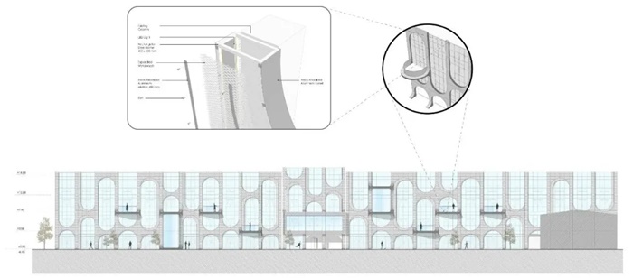 从时尚界纺织品和图案中得到的启发, 北京时尚创意工厂(Beijing Fashion-Factory)振兴了一个曾经的工业场所, 成为一个丰富的、具有创造性的活力时尚办公空间。织物的编织特质被用作设计驱动力, 通过参数化设计及数字建造的方式来定义各种空间及外立面的风格、改造生成建筑的” 第二层表皮 “。该设计运用了一系列时尚设计师的调色板, 包括悬链, 缝合, 图案和编织。这个概念与理论家 Gottfried Semper 早期的建筑概念化有关, 他追溯了 "墙" 这个词的词源, 回到了它的纺织品和织物的起源, 空间的划分并不是简单地用砖石来定义的, 当代混凝土, 玻璃和金属, 还包括织物的悬垂作为外壳, 以及后来纺织品和图案的应用, 用于挂毯的形式等, 既用于建筑的被动保温与隔热, 以及审美和装饰功能。
