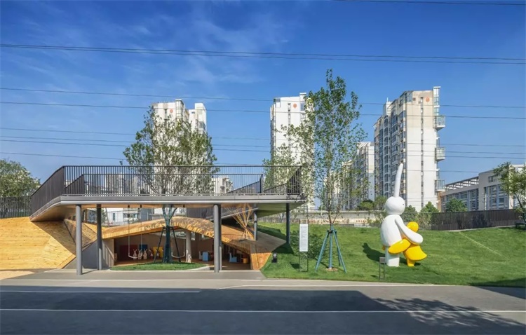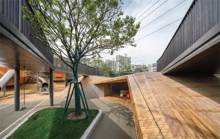 利用自然来解决后场的高差,这与传统的“平整地面,过度保护”的方式截然相反。奔跑、攀爬、躲藏,儿童的乐园不是限定他们的行为,而是释放他们的天性。通过折板曲折的跑道,我们希望通过立体化的设计,增加小孩子的运动量,环通的跑道就能让孩子们连续不断的跑起来。利用折板跑道的高差,我们将开放式教室设置于此,用来满足教学功能的多样性,也是“寓教于乐”的一种方式。