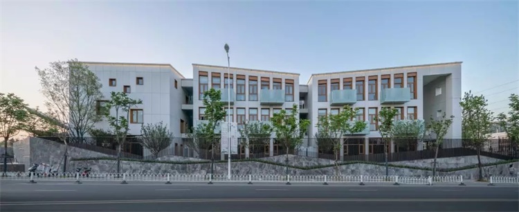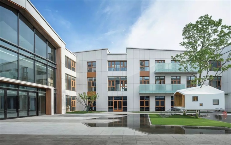 两个城市界面,分别都呈现为三个盒子,天际线与围墙线统一为折板的形式,变化中带有一些俏皮感。除此之外,建筑并未过分渲染幼儿园的建筑特性,色彩上采用大面的白色和少量的木色,营造出一个质朴自然、现代简约的建筑氛围。材料的选择颇费周章,最终选用浅灰色岩态板,大幅轻质环保板材本身可以实现与门窗一致的模数,同时采用同色铆钉的固定方式又能体现细节的考究。南向及内院界面加入了跳动的阳台,磨砂玻璃在阳光的作用下,为建筑增添朦胧的美感。空间品质往往能带来内心的感触和体验,在南京星河幼儿园的这次实践中,我们实现了一个有温度的建筑。