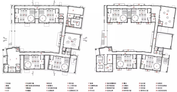 围绕内院的是室内回廊空间,尽量多的玻璃面,将内院之景纳入其间。同时,在中心的建筑体量上,建筑师试图创造一个通畅的场所,模糊内外的界限,激发孩子的探索精神。有些孩子表象上看起来孤独,但并非真正喜欢孤独,这类孩子往往内心更渴望关爱,他们或者不会表达自己,或者不懂得交往,亦或者没有人教过他们[7]。人与人之间都会被相互吸引或者排斥,从而产生某种空间交互反应。而尚处于学习认识世界的懵懂孩子们,对于人与人、人与空间的关系更为敏感,当他们处于群体活动环境中会比成年人更快做出反应,这种快反应,对于早熟的孩子固然游刃有余,但对于晚熟的孩子会更加打击他们认识世界的积极性,导致抗拒在空间中的交往,久而久之,此处的空间将会变得冲突甚至会消隐其空间作用。