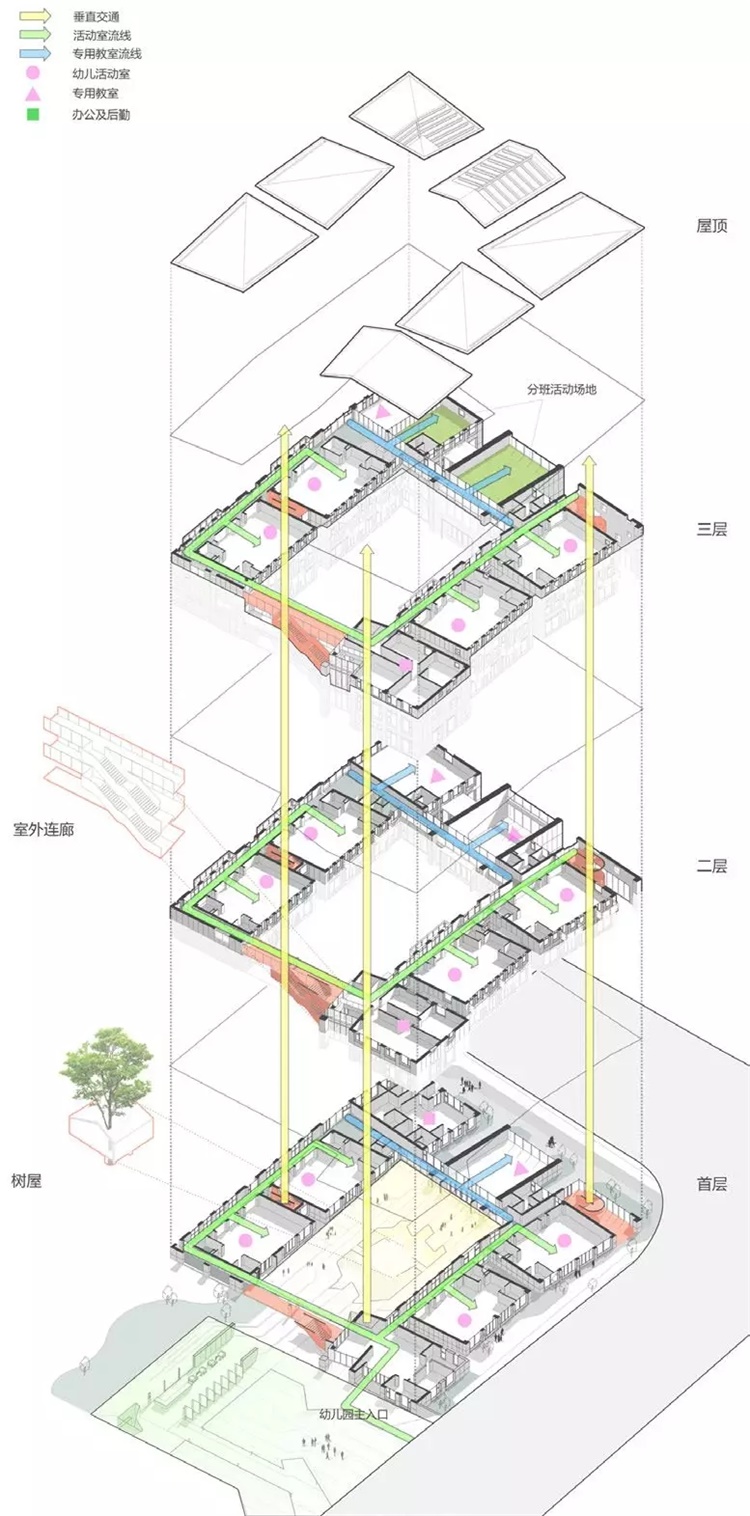 传统幼儿园大多以满足居住区配套为目的,南京星河幼儿园突破传统,在有限的条件内,运用中国“庭院”元素,使得幼儿园的空间更加丰富,并帮助孩子们认识自然、认识社会、塑造自己[5]。