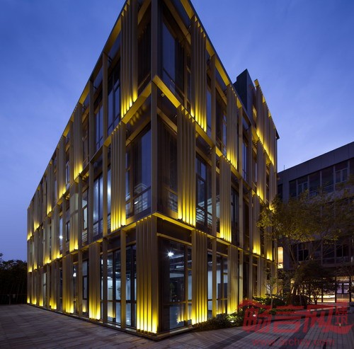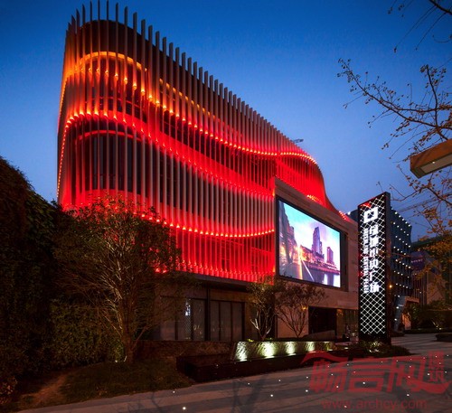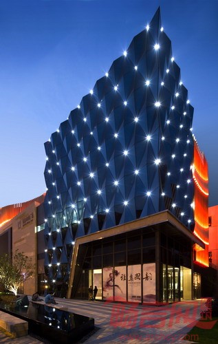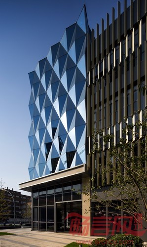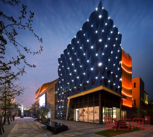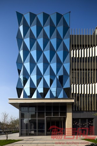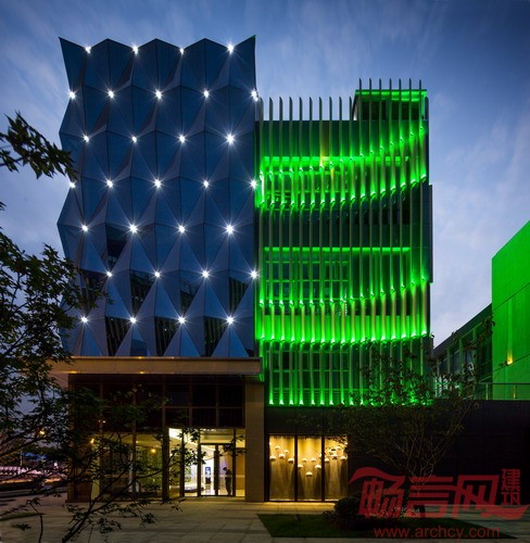 玻璃、金属和石材是立面设计中主要运用的建筑材料,玻璃的冷峻、金属的精致和石材的硬朗恰好迎合了高新技术产业园的“高、精、尖”气质。以沿街商业为例,双层的“菠萝皮”部分由菱形网格结合玻璃幕墙构成,体量清晰简洁,可识别性强;而曲面状的“浮云皮”由竖向杆件通过旋转和色彩变化,形成漂浮云效果,在夜间通过灯光变化实现绚丽多彩的效果。