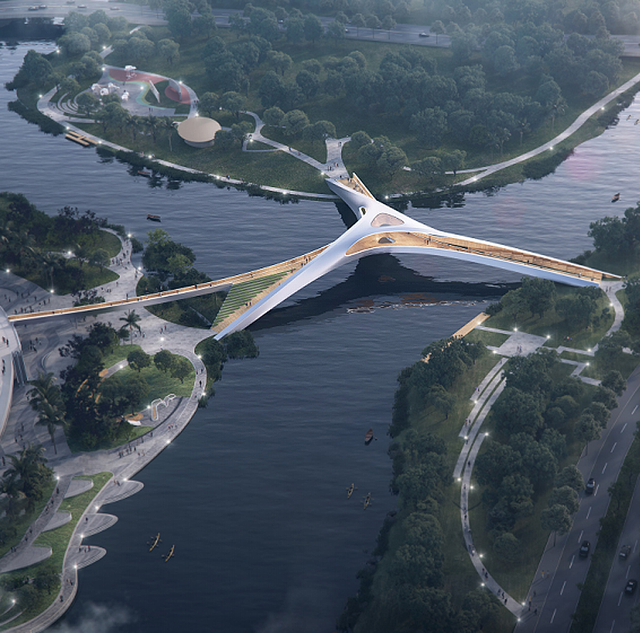 招标项目包含五座景观桥梁及周边景观改造提升,其中聚星桥为核心工程,以何镜堂院士领衔的联合体设计团队紧密合作,提交的聚星桥方案新颖独特,造型优美。桥梁采用(86+86+86)米Y型120°对称的三肢刚构拱梁组合体系,横跨两河汇流之处,以最短距离便捷连通三岸。三肢桥体汇聚核心,形成浪漫舒适的水上休闲空间。桥身曲线光带错动,交织形成“未来之窗”,作为景观焦点,与三湾对望。桥梁体现出南沙港澳合作区年轻、活力的形象,象征粤港澳大湾区三地携手,汇聚同心,共创美好未来。