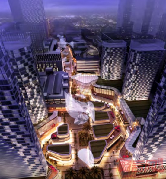 空间形态设计:整体空间采用围合布局,利用高大的规划建筑——塔楼,使零碎的用地内改造升级建筑整合,发挥群体空间效应。并利用西北角超高层高度优势,打造区域乃至昆明的名片,提升本项目档次与标志性。
