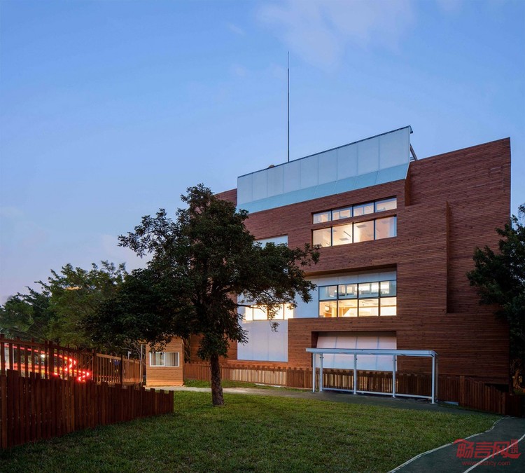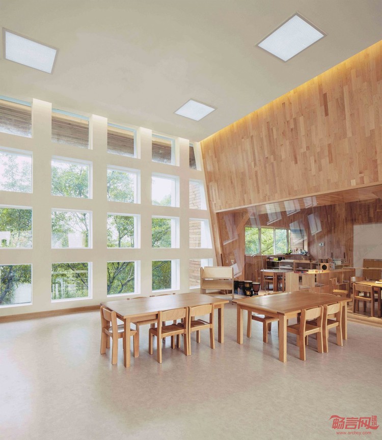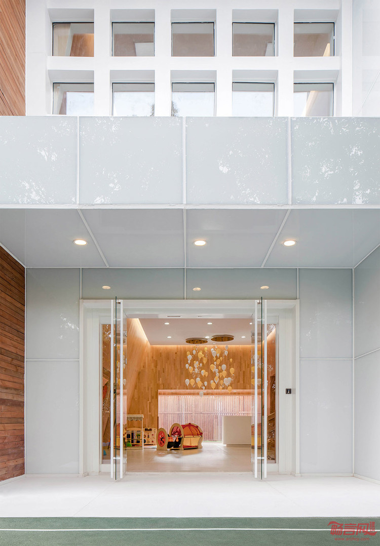 建筑立面的重新分割使该项目内部带来不同的视野,从而使整个建筑变得更为开放。 铝,防腐木,白玻等材料的使用与室内装饰材料相呼应。除此之外,该设计手法消除了封闭的感觉,同时更符合儿童的视线高度,并引入更多远处的风景和视野,使儿童,教师甚至附近街区的居民都能享受其中。