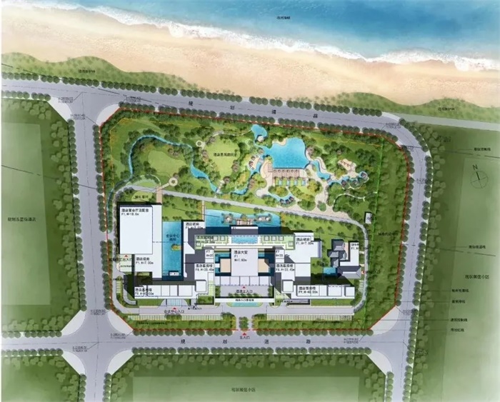 本项目总建筑面积约33500平方米,设计师利用潮位线退线范围,在基地上布置了40000平方米的开放空间和园林水景。其间流水潺潺、步道曲径通幽、林木间鸟语花香,使客人宛若置身于天堂。酒店以现代的简约姿态融合于其依山傍海的美妙自然环境之中。