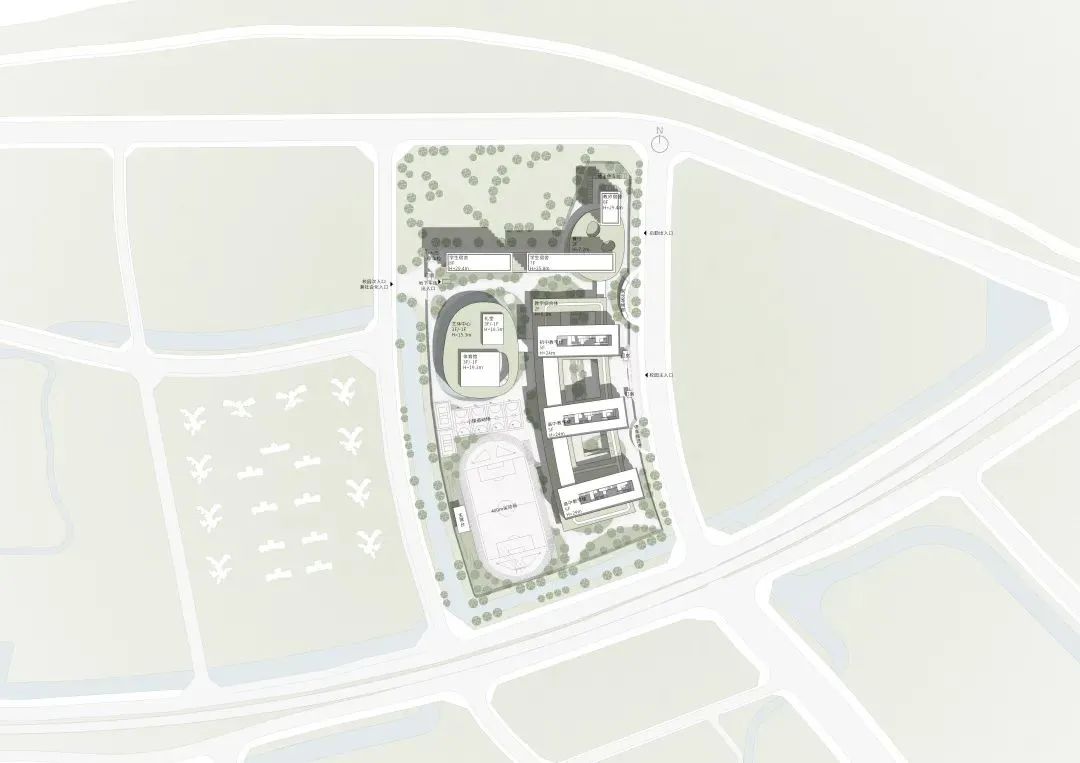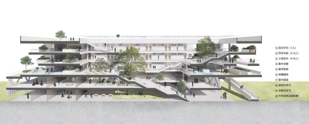 设计力求学习空间、学习方式、课程体系、教育技术和组织管理的协同创新。校区整体规划引入“学习社区+教学综合体”“住宿学院”及“社区化艺体中心”这三个空间组织概念,目标是将学校打造成为一个共享融合的学习社区。