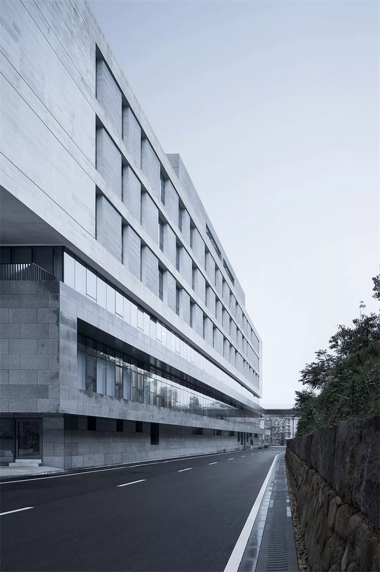 建筑主要的办公部分功能采用一个漂浮在折板平台上三层高的长方体盒子,纯粹而简洁的形体顺应南侧折板平台走势,并与北侧山体等高线平行布置;同时,盒子在东侧悬挑于三层以外约12米,使盒子与下部折板平台形成了在错动中取得平衡的一种形体组合。