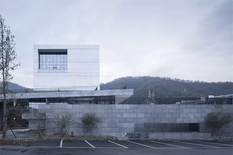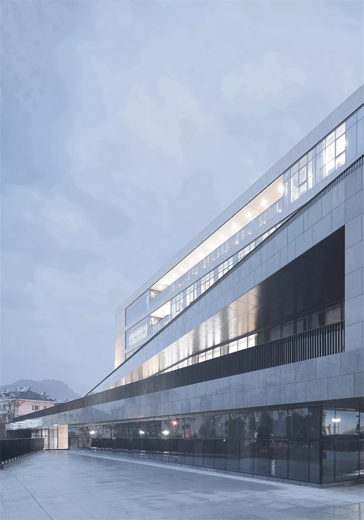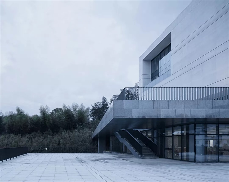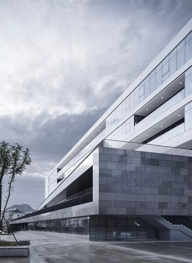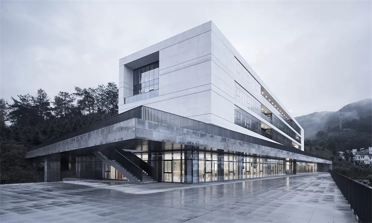 建筑采用黑白灰色系以体现开化山水城市及中国山水画卷中的具有人文意境的建筑色调,待山中云雾缭绕时,建筑的基座消隐在山中,上部灰白色的盒子犹如漂浮在山中,同时站在不同的平台上观远处山景和江景,形成了一幅建筑与周边山体和天空融为一体的感觉。