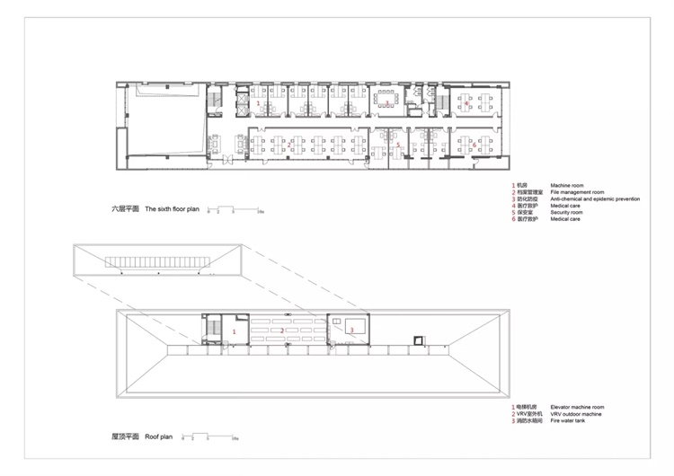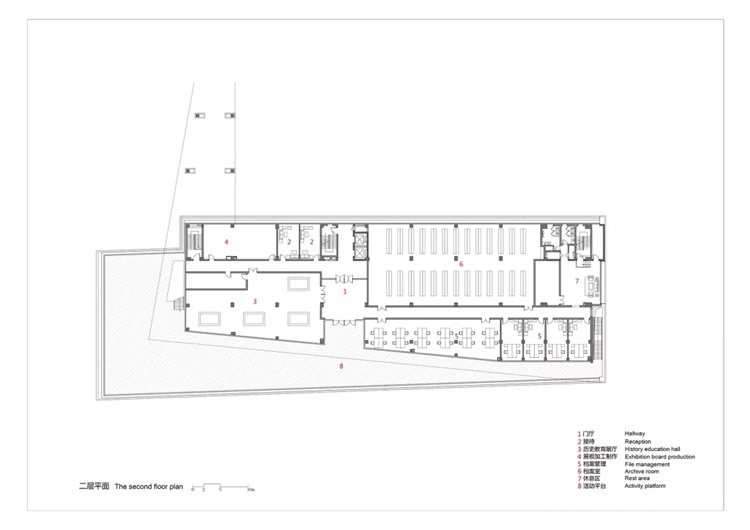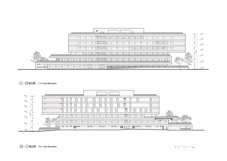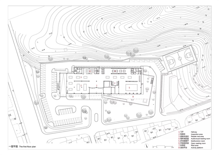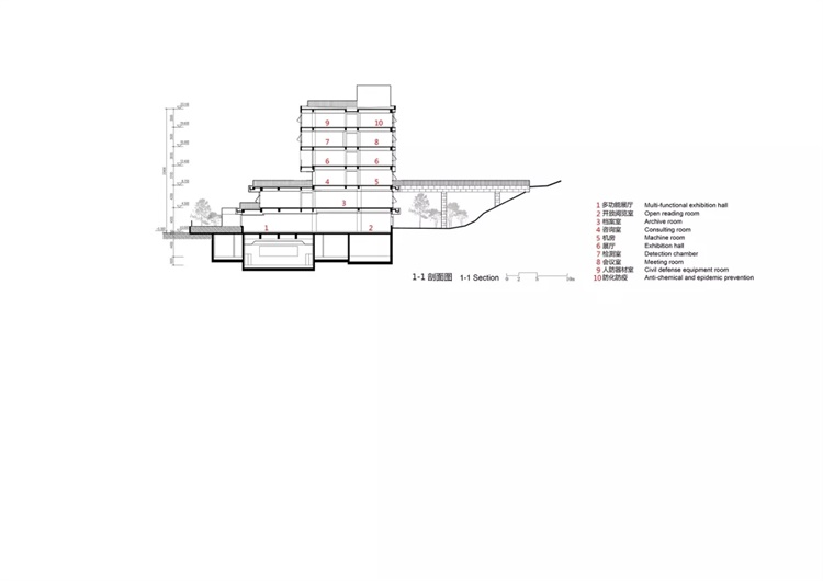 基地内有一条小路连通北侧山体做为人们日常上下山的通道,设计为了充分尊重现状场地和诸多外围的景观资源,提出了不同标高平台的解决方案。即将人流量较为密集的城市档案馆分布在底部一层,通过坡道与楼梯等连接不同标高的平台,犹如北侧山体等高线的延续,使下部建筑与山体自然融为一体。这不仅恢复了原有上下山通道,同时多标高平台又成为当地市民和使用者驻足观赏周边风景的理想场所。