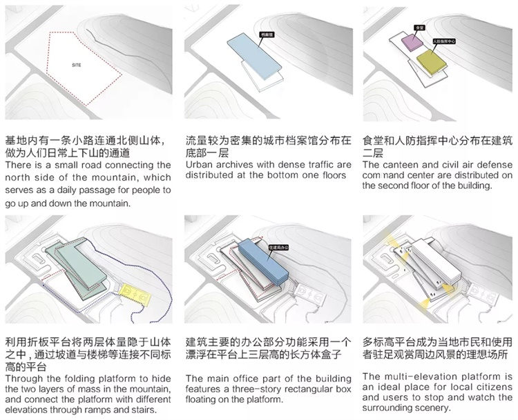 设计首先将人流密集的城市档案馆置于底层与半地下室;其次将食堂置于二层靠近西侧道路处,将人防指挥中心布置在二层靠近山谷腹地处,利用折板将下两层体量隐于山体之中;最后,将住建局办公置于折板之上,通过悬挑等手法使建筑有一种于山体之上的视觉效果,最大程度利用景观资源。