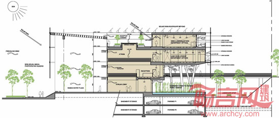 开放的办公空间打破了传统的分级办公环境,并有利于生态节能;每一个开放办公空间都有共享空间,如屋顶花园,庭院,中庭等,这些空间为不同部门员工,及不同级别员工提供了良好的交流环境。