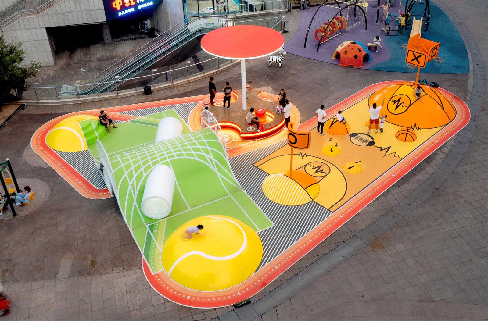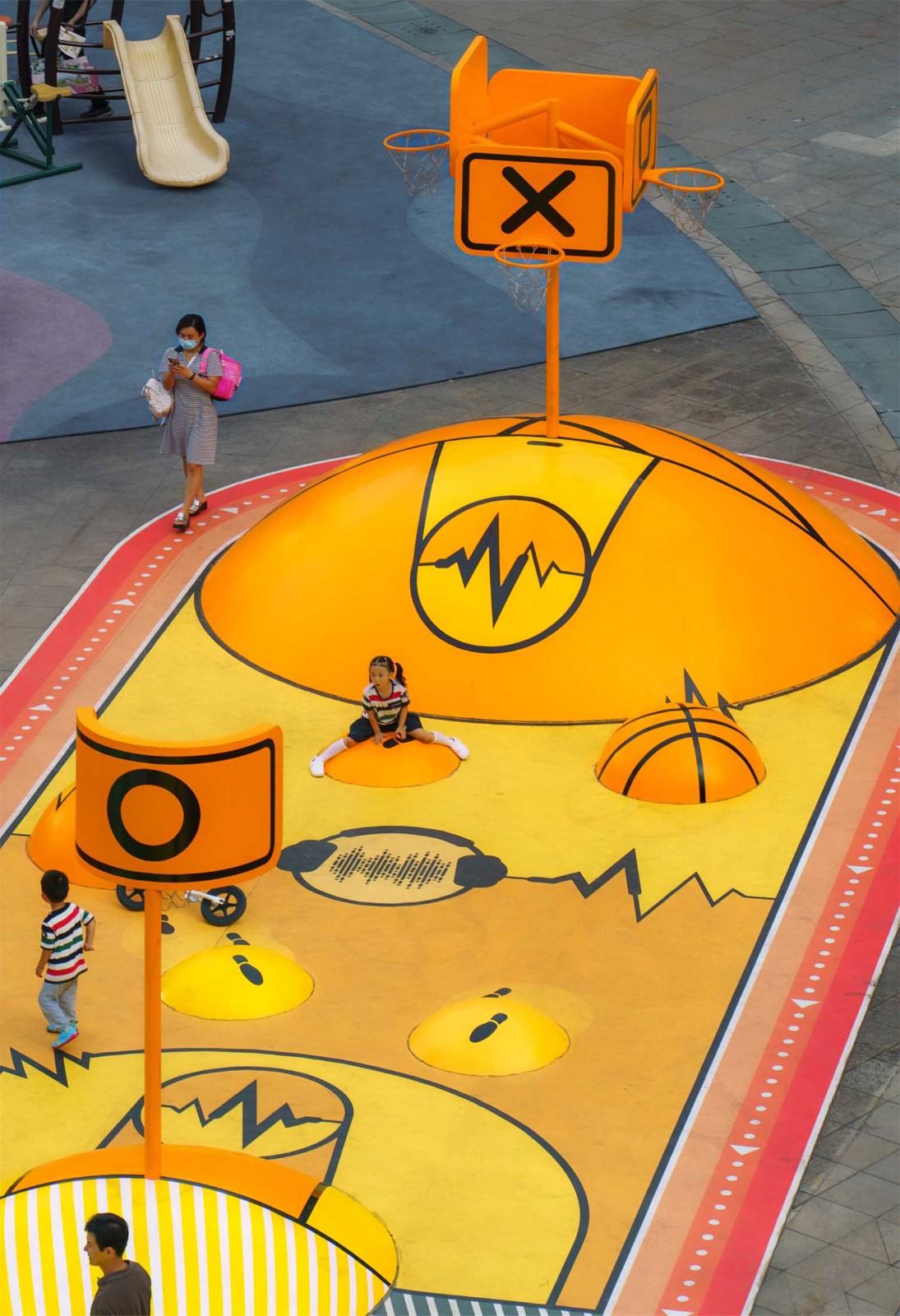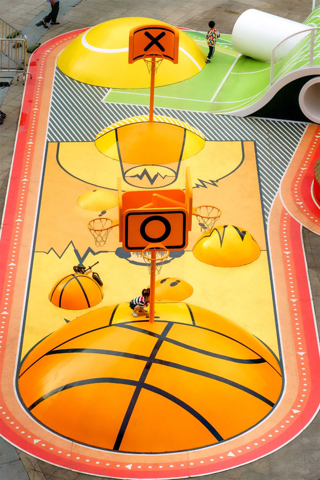 这些超现实的运动场通过跑道连接在一起,为孩子们提供玩耍的机会,以及通过在创新的“咬合”木板上提供休息的机会,成为公共家具以及成人和其他社会团体的聚会点,通过装置促进社交互动。