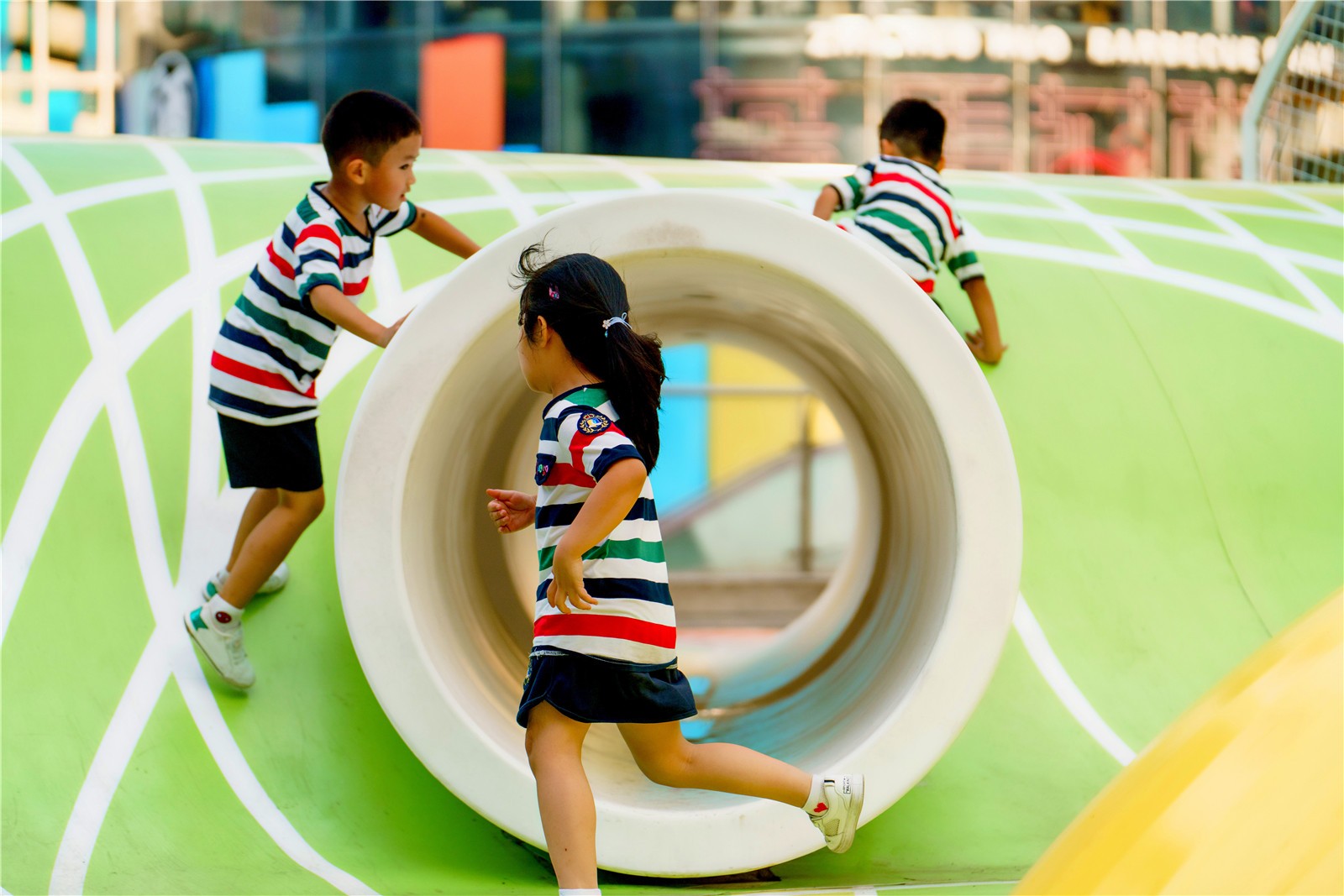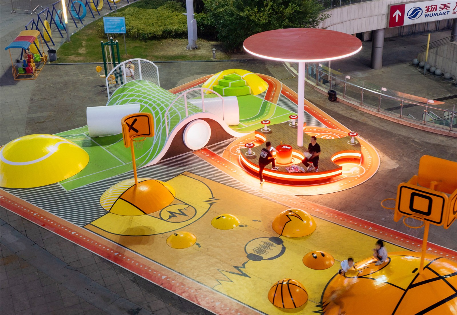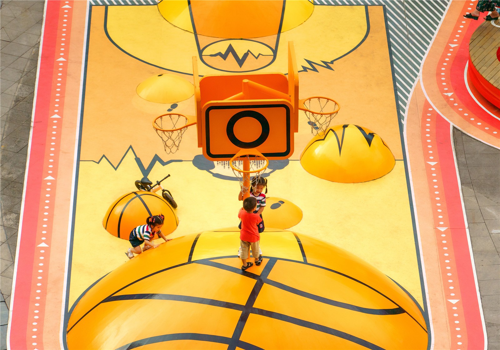 这些超现实的运动场通过跑道连接在一起,为孩子们提供玩耍的机会,以及通过在创新的“咬合”木板上提供休息的机会,成为公共家具以及成人和其他社会团体的聚会点,通过装置促进社交互动。
