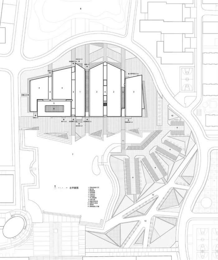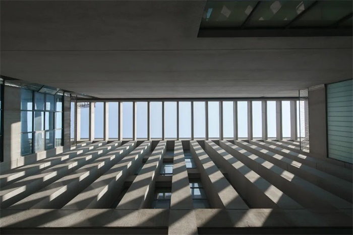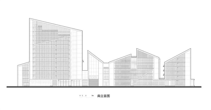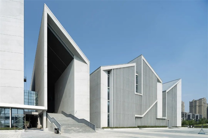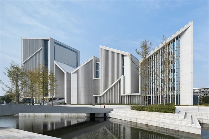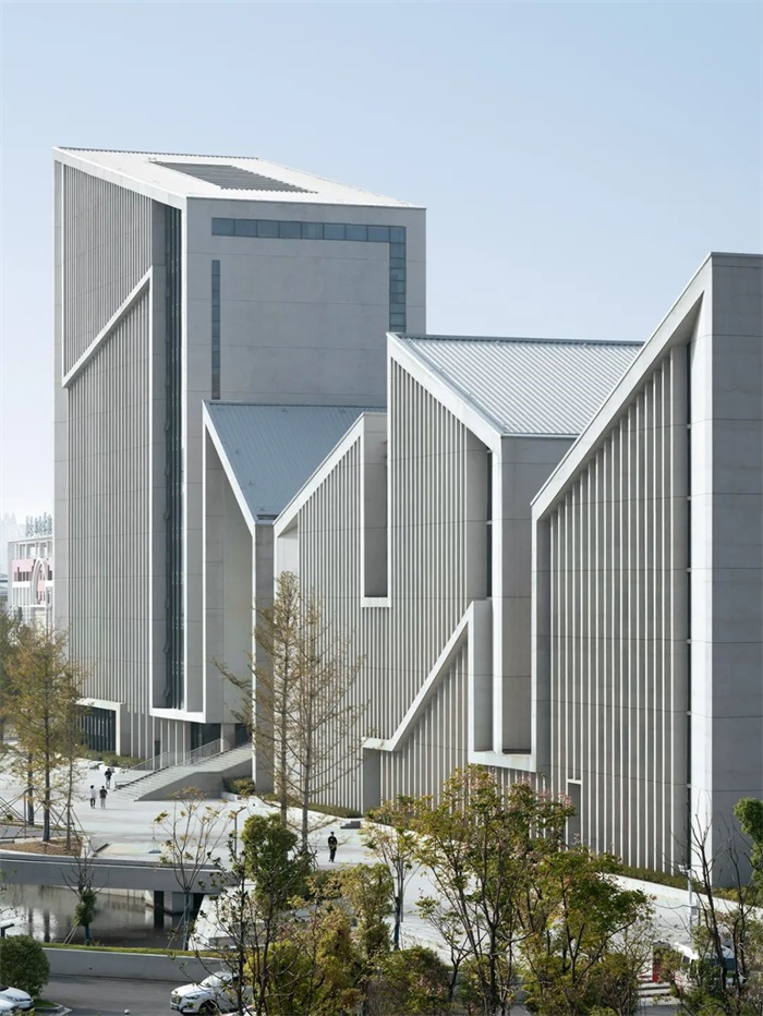 纵向条块在南侧保持齐平,北侧平面根据路型进行斜切和转折的变化,屋顶则通过高低起伏的折顶将几大功能体块组合成一个整体,南北立面再覆以间距、进深不等的混凝土竖向百叶,强调建筑的整体性和标志性。