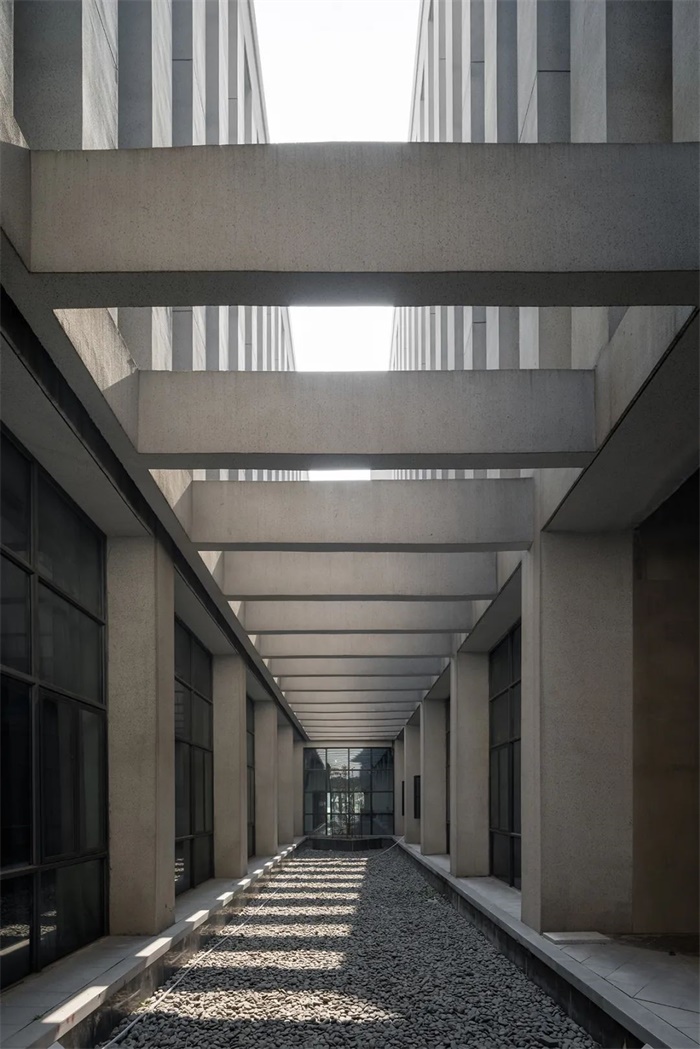 设计借鉴传统“冷巷”的智慧,引入五个南北向的夹缝天井,将建筑体量化整为零,划分为六个条状建筑,不同的条块对应不同的功能。纵向院落也将南北向景观和视线联系起来,使建筑成为南北校园空间对话的重要媒介。同时不同功能块通过相互之间的天井院落促进自然通风采光,摒弃空调,实现低造价下的被动式环保理念。