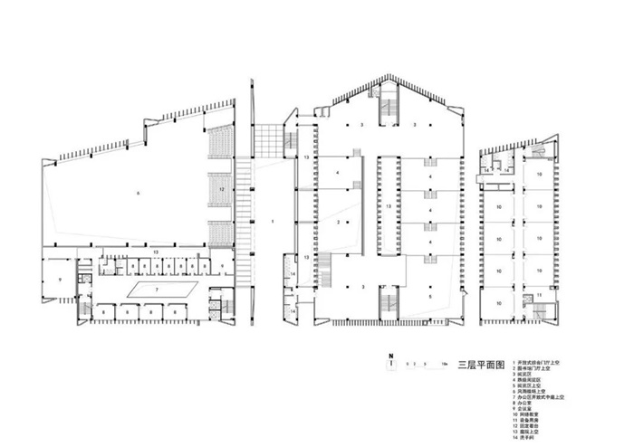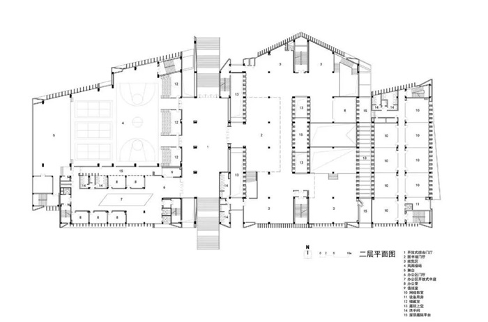 为解决图书馆、行政楼、风雨球场三大功能块的交通和动静分区问题,建筑师在三者之间设置了一个中心共享交通体,通过这个开放式综合门厅进行分流来解决复杂流线的问题,同时将“动”的风雨球场和“静”的图书馆严格分隔开,避免相互之间的噪音干扰。