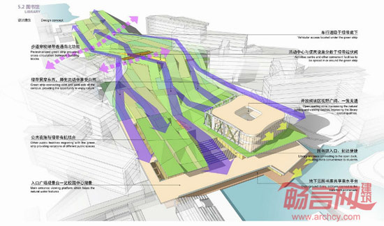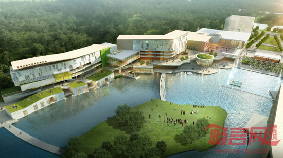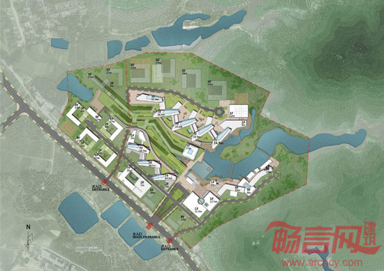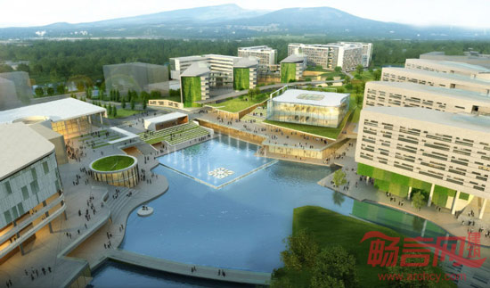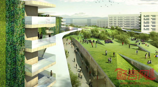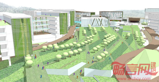 建筑师以「大学小镇」的设计概念,用一条绿色纽带将校园与附近村落和配套连接起来,令校园无论在地貌环境还是建筑设计上均自然地成为整个城镇的一部分,项目在功能上恰巧完善了原本缺少教育和公共设施的区域,加强了产、学、研、居四部份的联系。